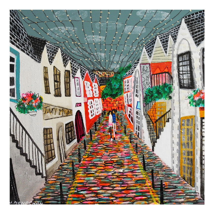 Nikki Monaghan brings Ashton Lane to life in her own unique style, capturing the charm of this location with bright, vibrant colors. Her interpretation emphasizes light, atmosphere, and a playful sense of movement. This framed Giclée print allows art lovers across the UK to enjoy Nikki’s vision in their homes or offices, celebrating a familiar location in an entirely new way.