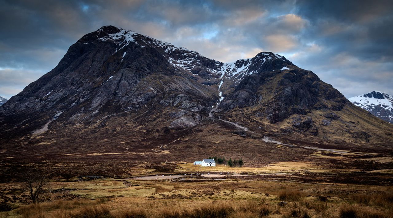 The “Cottage in Glencoe, Scotland” print captures the serene beauty of a traditional, white-washed cottage nestled amidst the dramatic landscapes of Glencoe. The composition highlights the cottage’s rustic charm, set against a backdrop of towering mountains and expansive skies, embodying the tranquil essence of the Scottish Highlands.