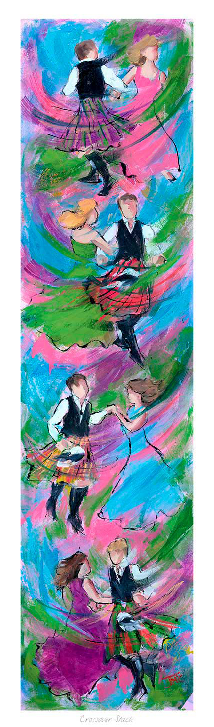 Janet works from photographs, sketches and from life, attending Highland Dancing competitions, Scottish Country Dancing events and Ceilidhs all over Scotland. Her aim is to make the viewer smile and to induce a sense of nostalgia while putting a modern twist on the spectacle of these ancient traditional dances. Janet’s paintings have been used to illustrate the Royal Scottish Country Dancing Society’s Annual Review since 2011.