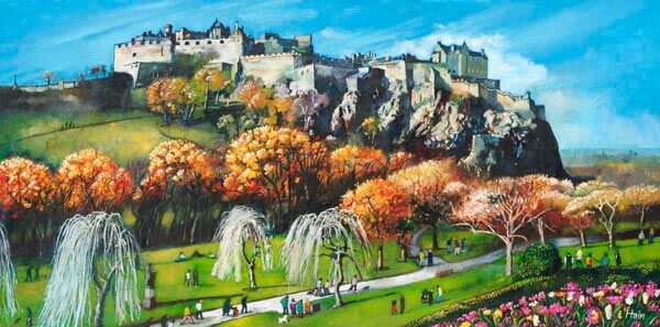 Rob Hain is a professional artist working from his home studio in the Scottish Borders. Specialising in the depiction of cities as well as towns and villages, he believes that people are what makes a community vibrant and appealing. Working in acrylic on canvas, he first establishes the buildings and structures, with their diverse styles and colours, before inhabiting the scenes with people, ‘to make the painting sing!’ He is equally at home in Glenfinnan, or gazing up at the amazing, iconic Kelpies, beautifully sculpted by Andy Scott.