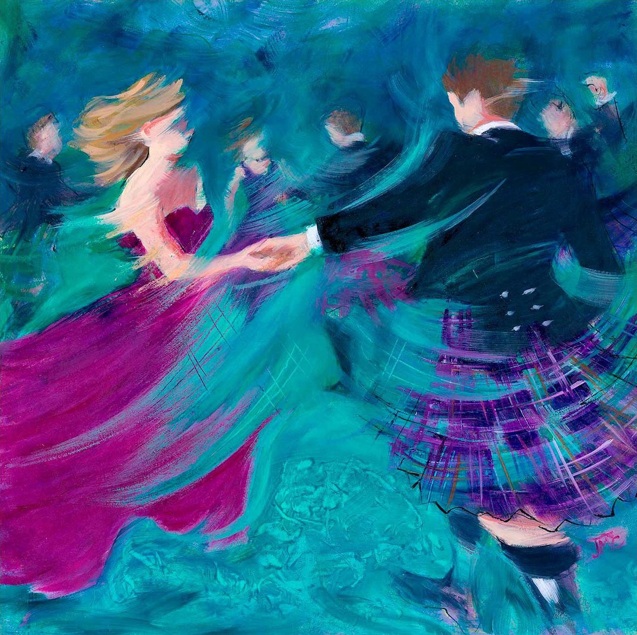 Janet works from photographs, sketches and from life, attending Highland Dancing competitions, Scottish Country Dancing events and Ceilidhs all over Scotland. Her aim is to make the viewer smile and to induce a sense of nostalgia while putting a modern twist on the spectacle of these ancient traditional dances.  Janet’s paintings have been used to illustrate the Royal Scottish Country Dancing Society’s Annual Review since 2011.