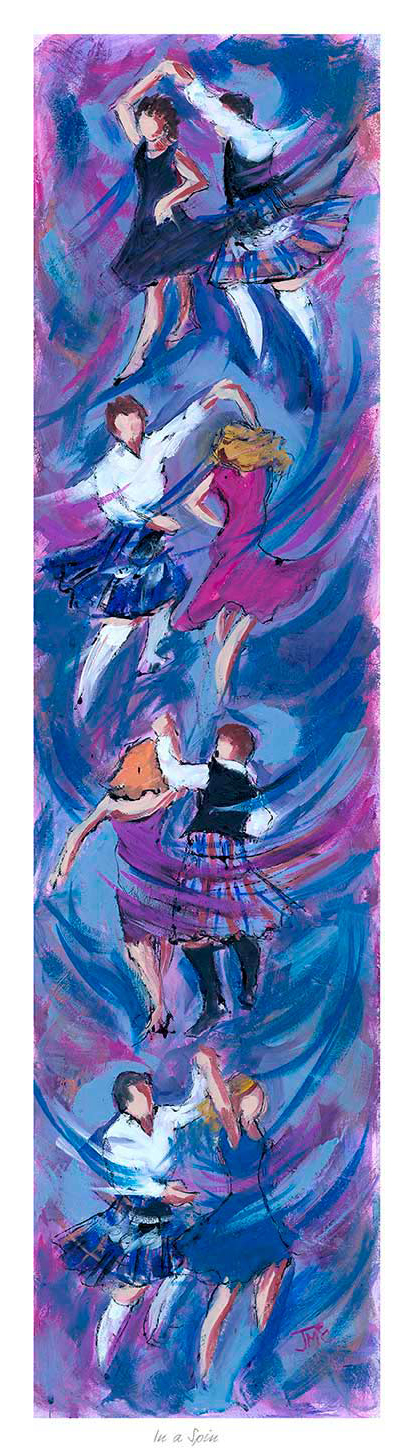 Janet works from photographs, sketches and from life, attending Highland Dancing competitions, Scottish Country Dancing events and Ceilidhs all over Scotland. Her aim is to make the viewer smile and to induce a sense of nostalgia while putting a modern twist on the spectacle of these ancient traditional dances. Janet’s paintings have been used to illustrate the Royal Scottish Country Dancing Society’s Annual Review since 2011.