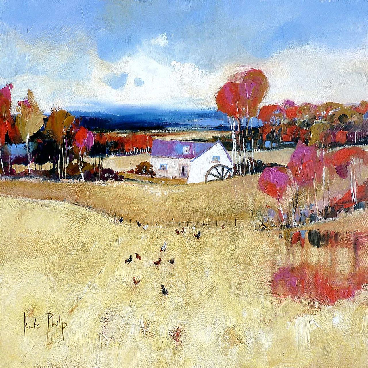 Kate Philp was born in Africa, brought up in Scotland and currently lives in North Northumberland where contrasting stretches of sandy beaches and rugged cliffs feature in her work. She also enjoys the white sands and turquoise waters of the West Coast and Islands which inspired many paintings by Scottish colourist Bunty Cadell, who was in fact Kate’s grandmother’s cousin.