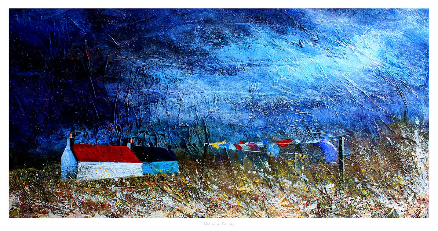 As a graduate of the Winchester School of Art her distinctive textural style emanates boldness, vibrancy, and atmosphere. Based in her studio at Inverness Creative Academy, she works in both oils and mixed-media and her unmistakably personal landscapes capture the uncompromising essence of the North. Her work is materials led. Experimental mark-making and a creative use of materials is derived from her training in textiles and as Senior Designer for Courtaulds Knitwear. To combine this approach with the imagery of her surroundings can be unpredictable and challenging. “The process is as exciting as the outcome…. I am always looking for visual elements that interest me which build in my subconsciousness like a virtual sketchbook”.
