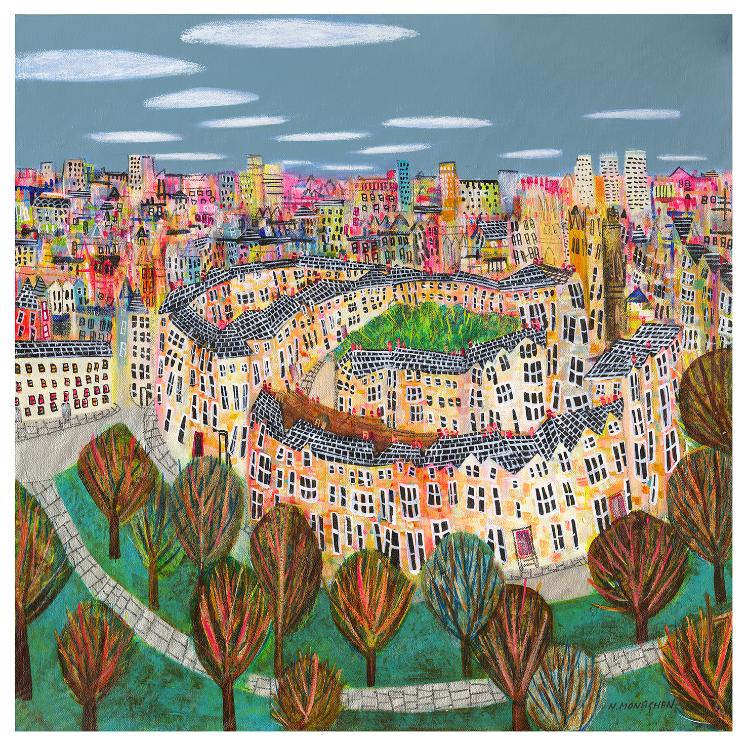 Acrylics, inks, oil pastels and charcoal are applied in layers in her paintings to create a stylized, simplified depiction of my subject. Nikki loves colour and always in awe at the emotion it can create. Nikki wants to paint joyful scenes of places, where memories are relived, and connections are made.