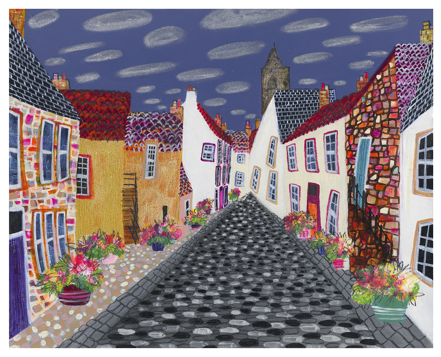 Silver Cobbles & Summer Pots, Culross Framed Limited Edition Fine Art Giclée Print by Nikki Monaghan.