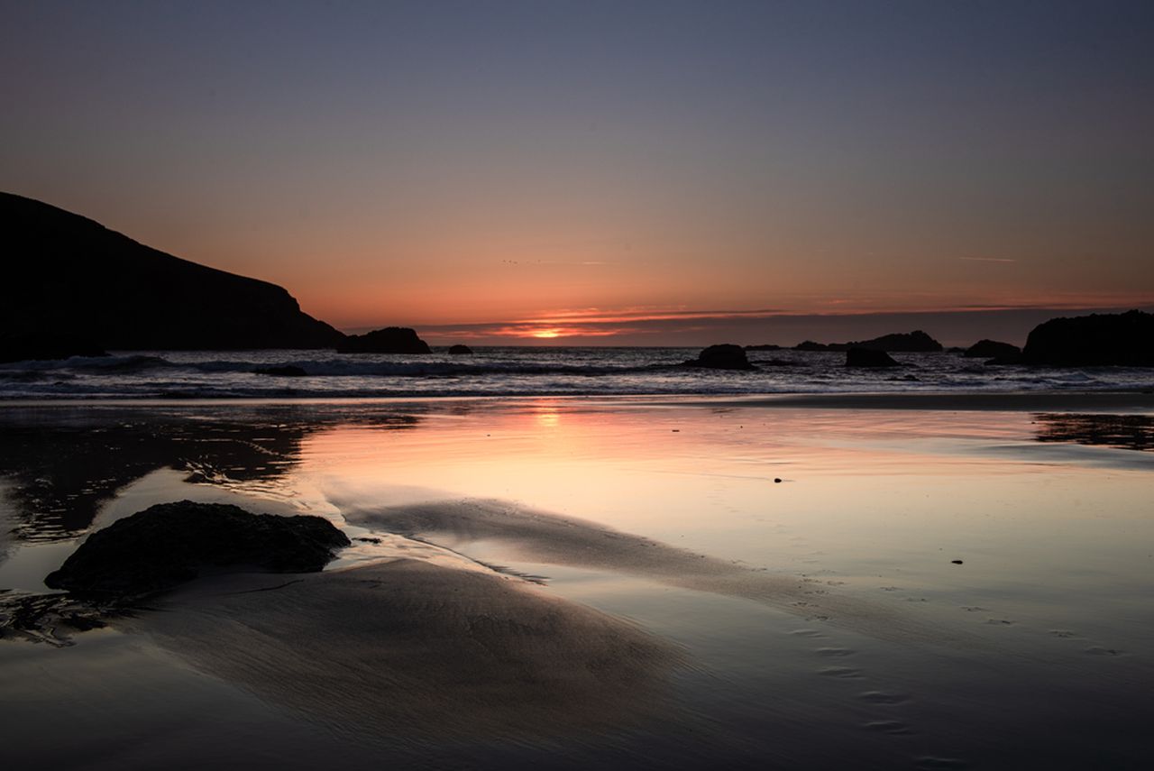 The “Sunset over ocean at Harris Beach” framed photograph print captures the serene beauty of a sunset at Harris Beach. The image showcases the sun descending towards the horizon, casting a warm, golden hue across the tranquil ocean waters. The sky is captured with a gradient of colours, transitioning from deep oranges and reds near the sun to softer pinks and purples as it stretches upward. Gentle waves lap against the shore, reflecting the sky’s vibrant colours and adding a dynamic element to the composition. The silhouette of distant landforms may be faintly visible, adding depth and context to the scene.