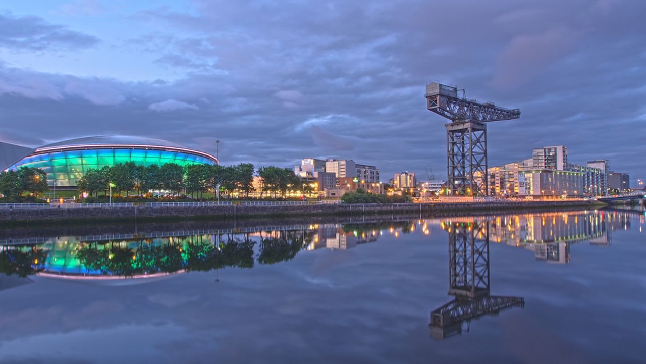 The photograph’s composition is meticulously balanced, with the Finnieston Crane positioned prominently, drawing the viewer’s eye to its intricate lattice structure. The surrounding modern buildings, with their sleek lines and reflective surfaces, provide a harmonious juxtaposition, highlighting the blend of historical and contemporary elements that define the harbour district of Glasgow in Scotland. The River Clyde itself adds a dynamic element to the scene, its calm waters mirroring the skyline and enhancing the overall depth of the image.