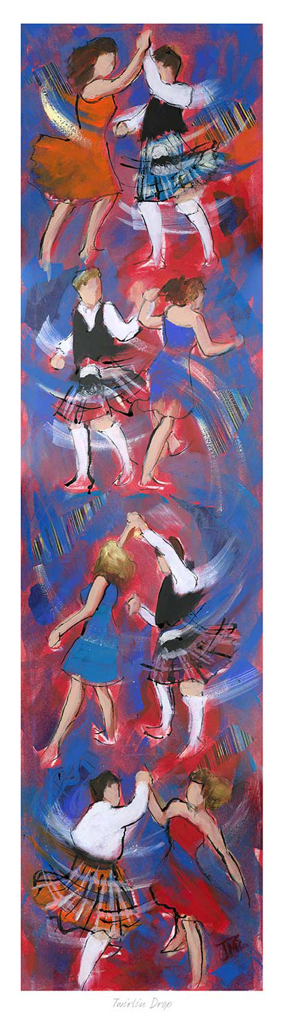 Janet works from photographs, sketches and from life, attending Highland Dancing competitions, Scottish Country Dancing events and Ceilidhs all over Scotland. Her aim is to make the viewer smile and to induce a sense of nostalgia while putting a modern twist on the spectacle of these ancient traditional dances. Janet’s paintings have been used to illustrate the Royal Scottish Country Dancing Society’s Annual Review since 2011.